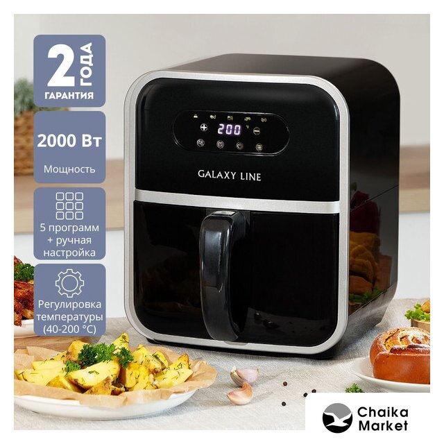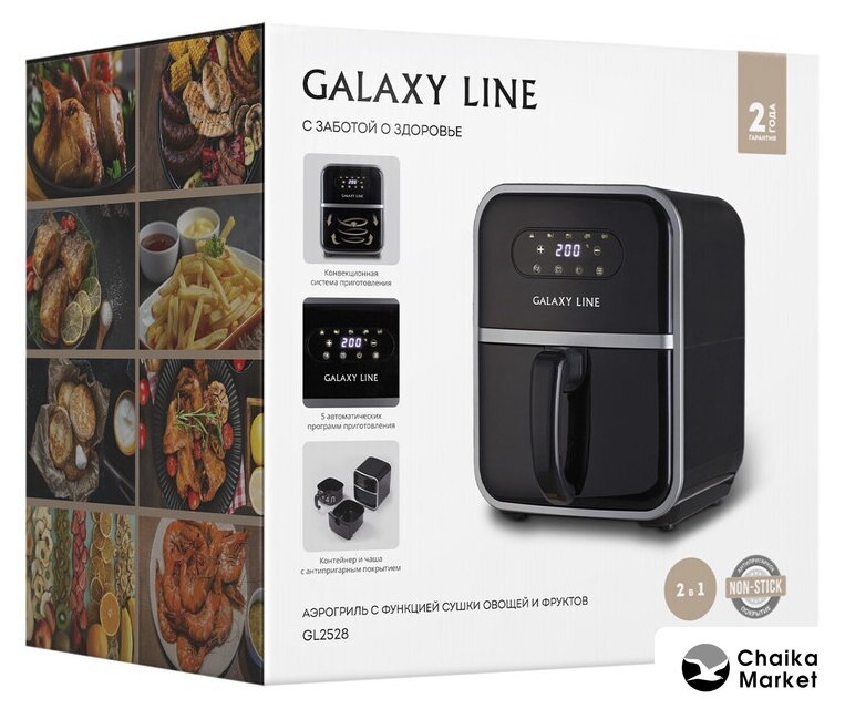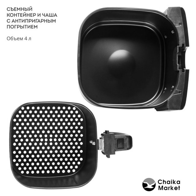 | Комплект поставки | - Аэрогриль с функцией сушки овощей и фруктов;- Съемный контейнер;- Чаша;- Книга рецептов;- Руководство по эксплуатации;- Потребительская тара. |