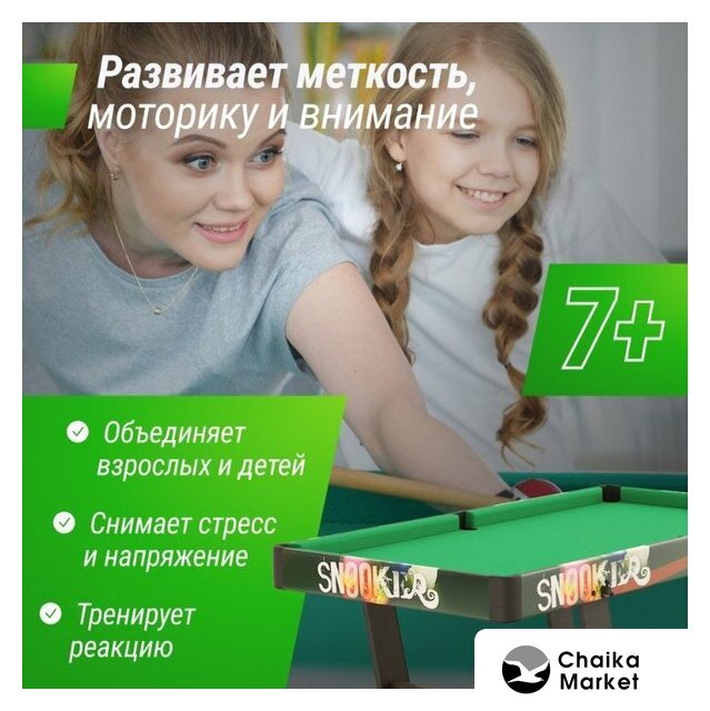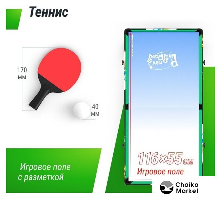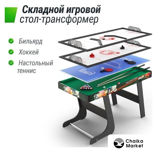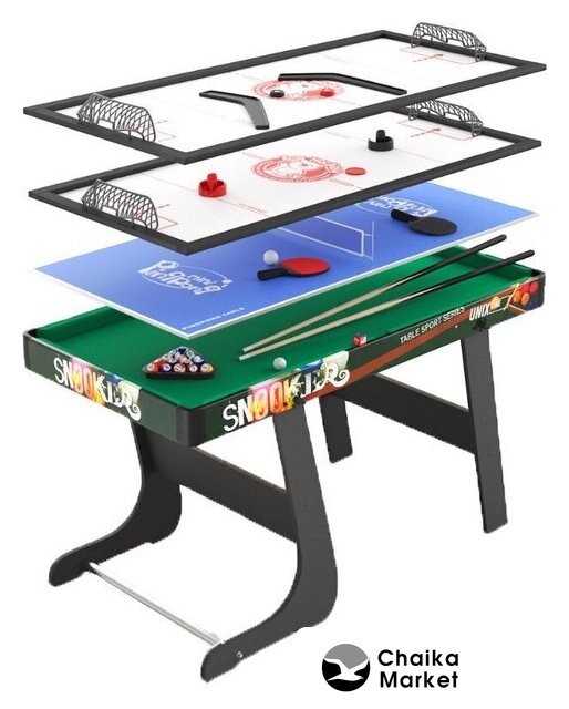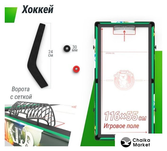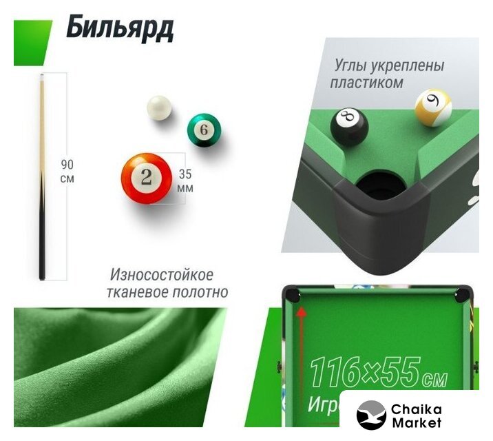 Комплектация | бита (2 шт.), бильярдный шар, сетка, кий (2 шт.), клюшка (2 шт.), шайба (4 шт.), ракетка (2 шт.), шар (2 шт.), мел |