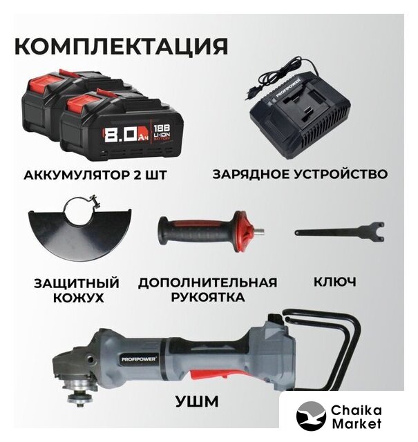 | Комплект поставки | - Угловая шлифовальная машина -1 шт- Зарядное устройство 1 шт- Аккумуляторы (8.0 Ач) 2 шт- Защитный кожух 1 шт- Ключ 1 шт- Внутренний фланец и контргайка 1 шт - Рукоятка 1 шт- Кейс 1 шт- Инструкция с гарантийным талоном 1 шт |