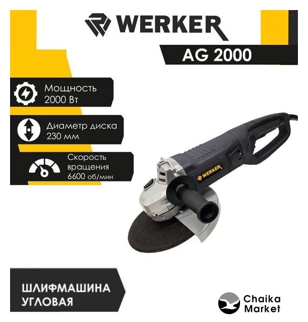 диаметр диска: 230 мм, 2200 Вт, 6600 об/мин холостого хода, питание: сеть, 6 кг