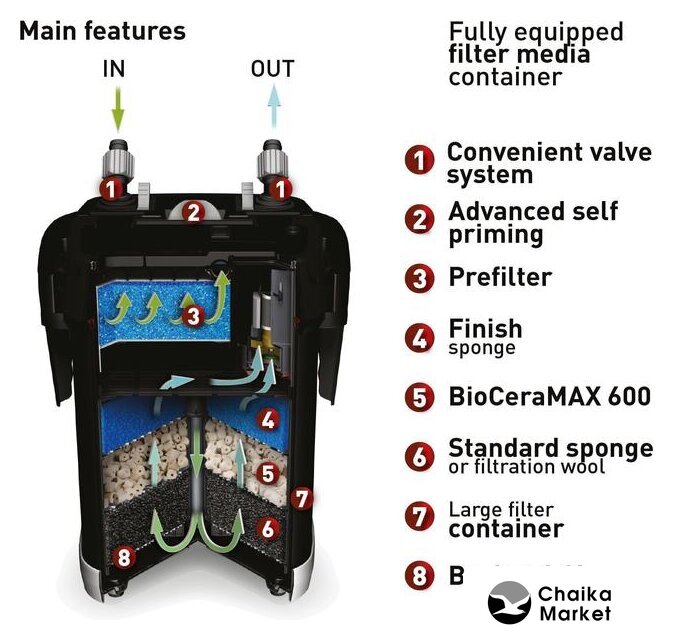 для пресноводного аквариума/для морского аквариума, производительность 3000 л/ч, объем аквариума 250-750 л, мощность 30 Вт, длина 28.5 см, ширина 28.5 см, высота 47 см