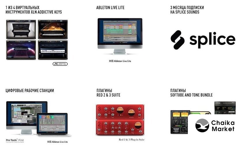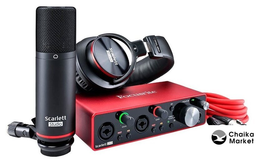 | Комплект поставки | - конденсаторный микрофон Focusrite Scarlett CM25 MkIII- мониторные наушники Focusrite Scarlett HP60 MkIII- держатель для микрофона- кабель USB Type-C - USB Type-A- кабель 3-pin XLR (M-F)- Ableton Live Lite- Pro Tools First Focusrite Creative Pack- набор плагинов (XLN Audio Addictive Keys, Softube Time and Tone Bundle, Focusrite Red Plug-in Suite, Focusrite Plug-in Collective)- 3 месяца бесплатной подписки на Splice Sounds- документация |