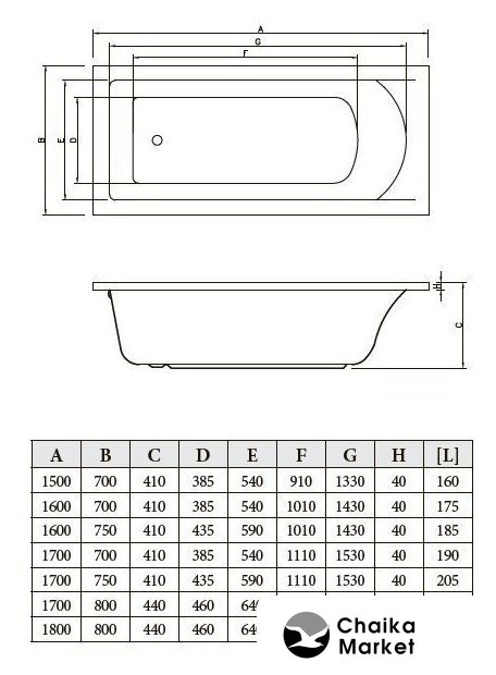 прямая, литьевой акрил, объем: 190 л