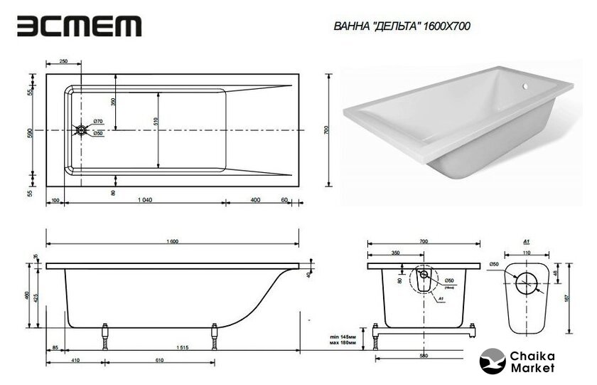 нестандартная, искусственный мрамор, отдельностоящая, объем: 170 л
