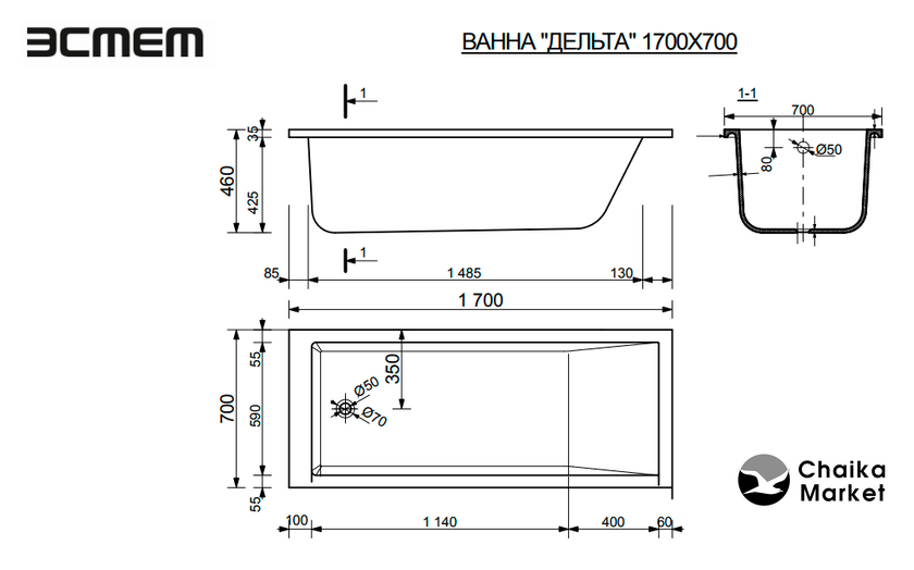 нестандартная, искусственный мрамор, отдельностоящая, объем: 170 л