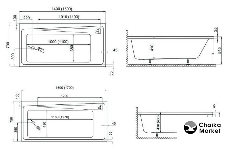 угловая асимметричная, акрил, объем: 280 л