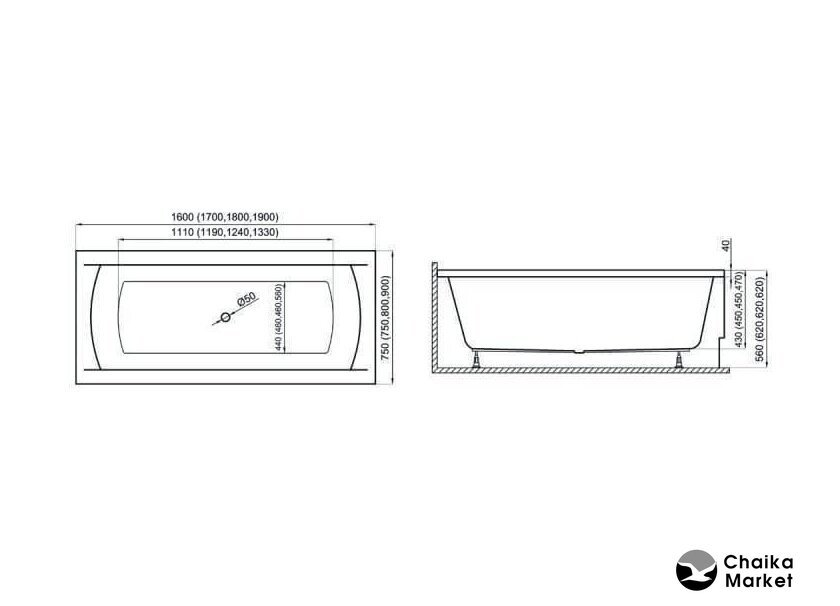 прямая, акрил, объем: 190 л