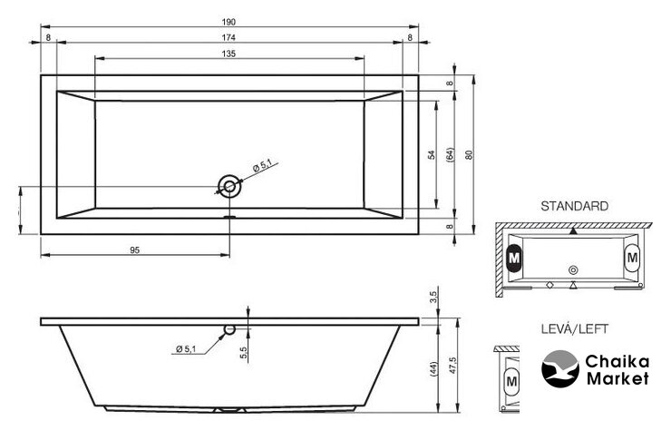 170x75 см, объём: 170 л