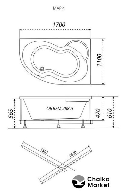 170x110 см, объём: 288 л