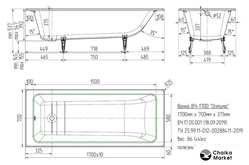 160x70 см, объём: 150 л