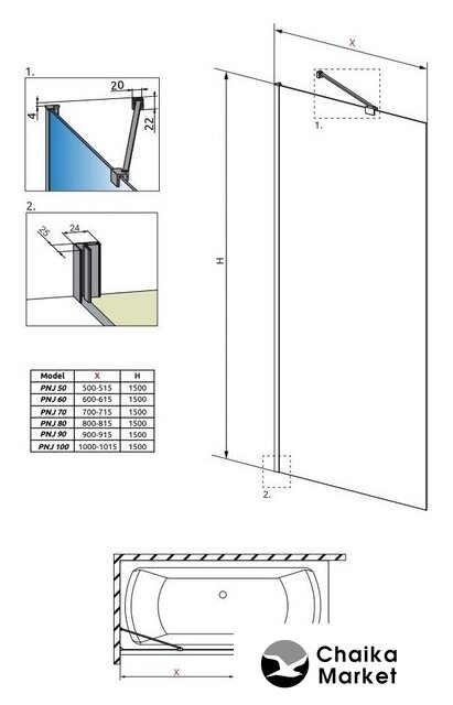 материал шторки закаленное стекло, стационарные двери, 162х150 см, прозрачный/матовый