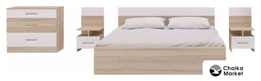 Состав комплекта | двуспальная кровать, комод, тумба |