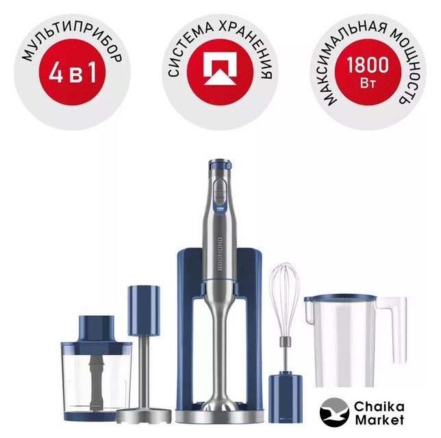 Комплектация | - Блок электродвигателя- S-образный нож- Насадка-блендер- Насадка-венчик- Переходник для насадки-венчика- Насадка для приготовления пюре- Чаша измельчителя с крышкой- Подставка для хранения насадок- Стакан для смешивания с крышкой- Руководство по эксплуатации- Сервисная книжка |