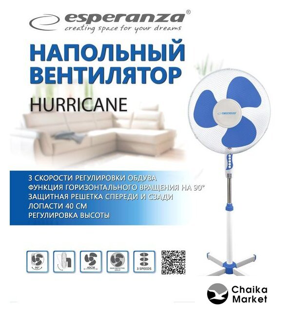 осевой, напольный, мощность 40 Вт, 3 скорости, управление механическое, лопасти 40 см, питание: сеть
