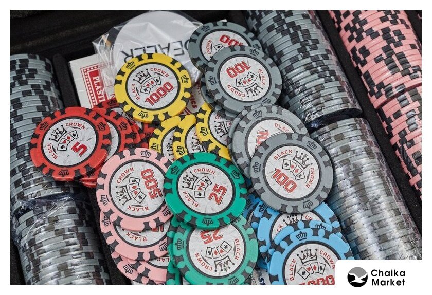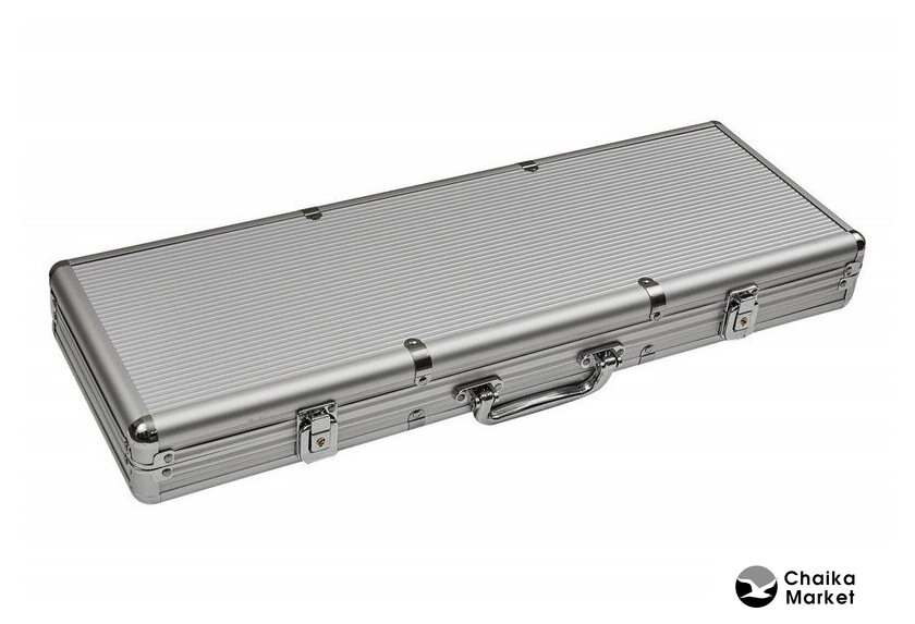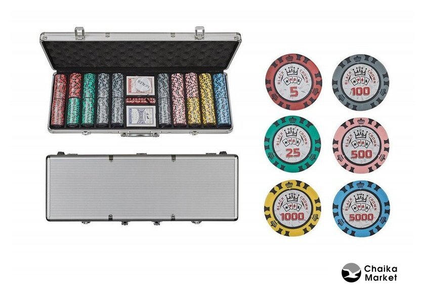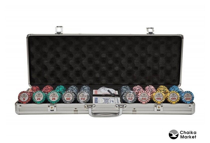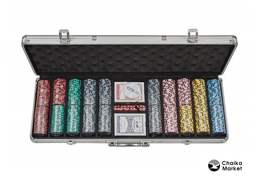 | Комплектация | 500 фишек, фишка дилера, 2 колоды карт, 5 шестигранных кубиков, металлический кейс |