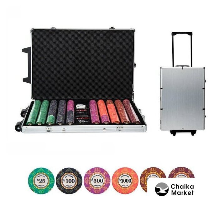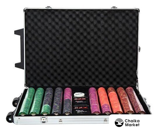 | Комплектация | 1000 фишек шести номиналов, три колоды карт из 100% пластика, пять игральных костей, фишка дилера |