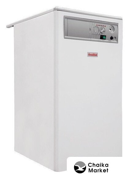 твердотопливный (пеллеты), 50 кВт, 500 м², одноконтурный, напольный, открытая камера сгорания, внешний бойлер