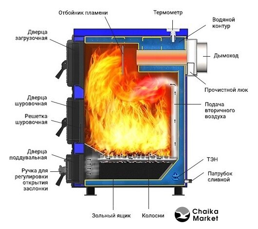 твердотопливный, 11 кВт, 110 м², одноконтурный, напольный, закрытая камера сгорания