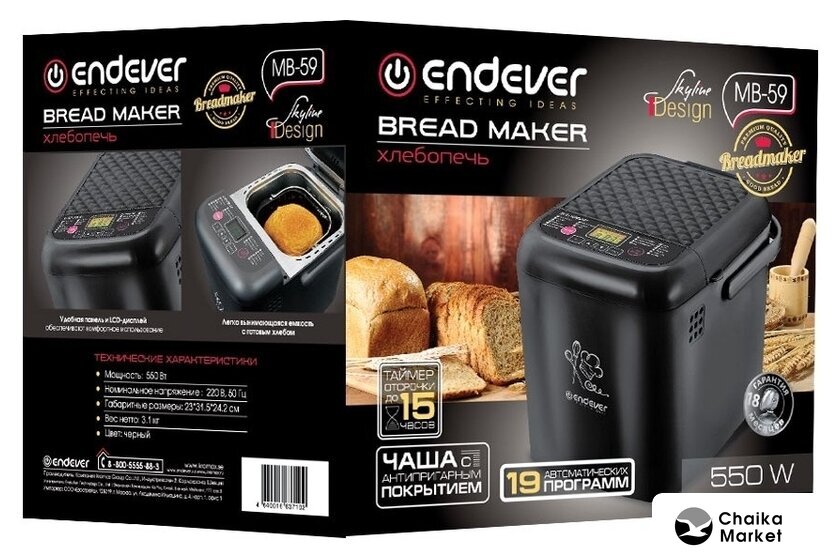 450 Вт, вес выпечки: 500 г, 19 программ выпечки, выбор цвета корочки