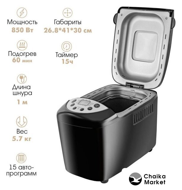 750 Вт, вес выпечки: 1000 г, регулировка веса выпечки, 19 программ выпечки, выбор цвета корочки, замес теста, диспенсер