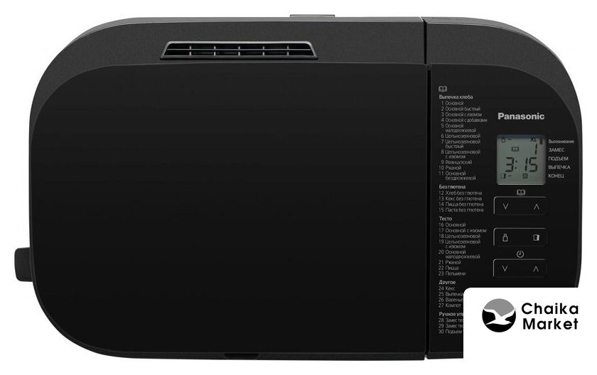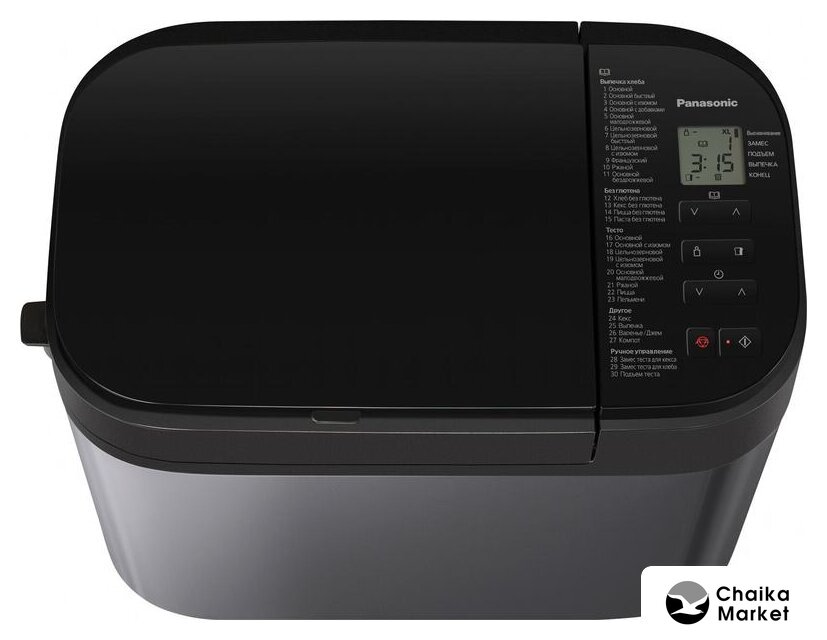 | Перечень режимов работы | Авто меню (Хлеб):1. Основной2. Основной быстрый3. Основной с изюмом4. Основной с добавками5. Основной малодрожжевой6. Цельнозерновой7. Цельнозерновой быстрый8. Цельнозерновой с изюмом9. Французский10. Ржаной11. Основной бездрожжевойАвто меню (Без глютена):12. Хлеб без глютена13. Кекс без глютена14. Пицца без глютена15. Паста без глютенаАвто меню (Тесто):16. Основной17. Основной с изюмом18. Цельнозерновой19. Цельнозерновой с изюмом20. Основной малодрожжевой21. Ржаной22. Пицца23. ПельмениАвто меню (Другое):24. Кекс25. Выпечка26. Варенье/Джем27. Фрукты в сиропеАвто меню (Ручное управление):28. Замес теста для кекса29. Замес теста для хлеба30. Подъем теста |