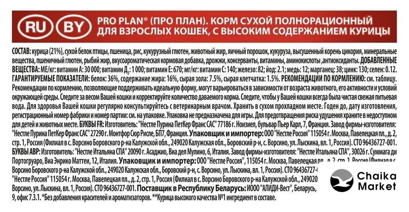 Ингредиенты | курица (21%), сухой белок птицы, пшеница, рис, кукурузный глютен, пшеничный глючен, животный жир, кукуруза, яичный порошок, высушенный корень цикория, минеральные вещества, рыбий жир, вкусоароматическая кормовая добавка, дрожжи, консерванты, витамины, аминокислоты, антиоксиданты. |