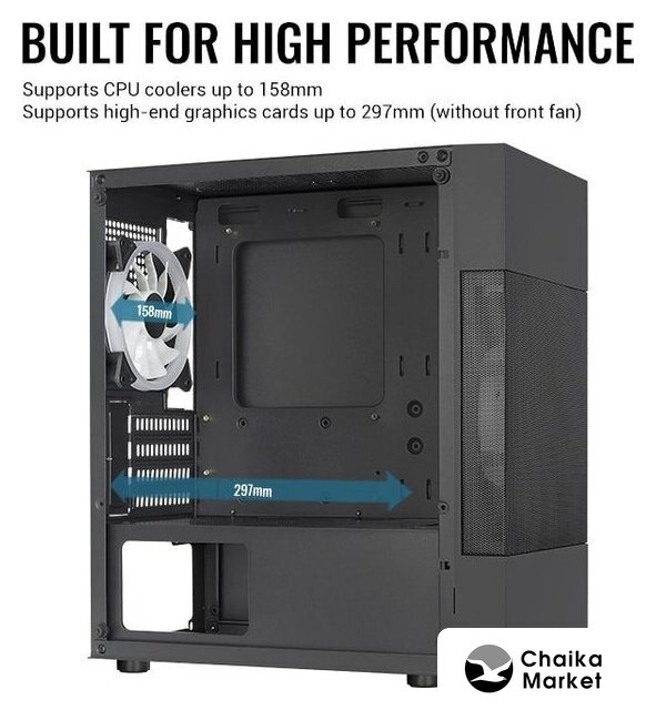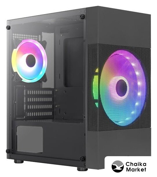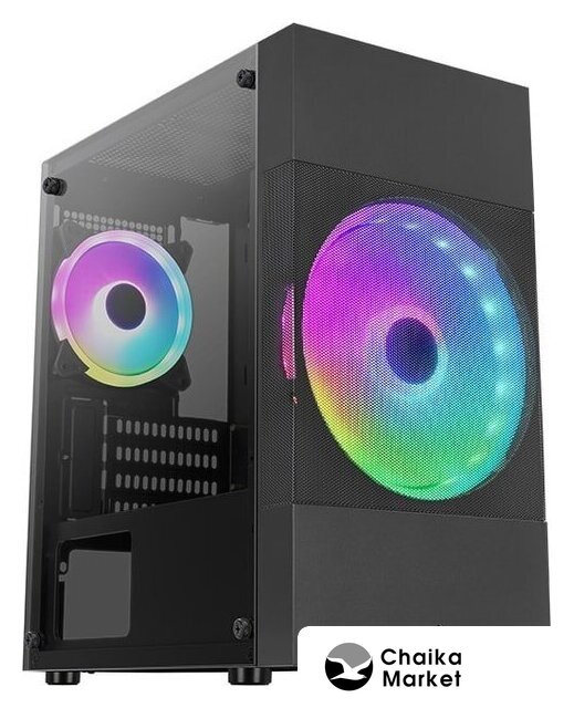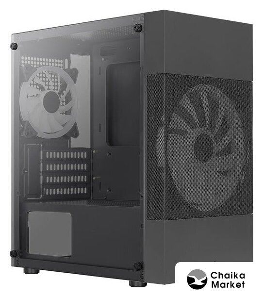 Mid Tower, БП отсутствует, для плат ATX/micro-ATX/mini-ITX, в комплекте 2 вентилятора, окно: закаленное стекло, видеокарта до 300 мм, охлаждение ЦП до 165 мм, пылевые фильтры, 2xUSB 2.0, 1xUSB-A 3.2 5Гбит/с, цвет черный