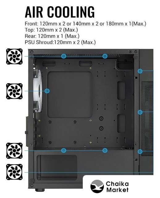 Mid Tower, БП отсутствует, для плат ATX/micro-ATX/mini-ITX, в комплекте 1 вентилятор, окно: закаленное стекло, видеокарта до 320 мм, охлаждение ЦП до 180 мм, пылевые фильтры, 2xUSB-A 3.2 5Гбит/с, цвет черный