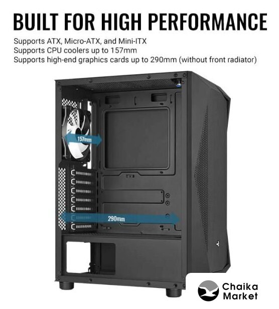 Mid Tower, БП отсутствует, для плат ATX/micro-ATX, в комплекте 1 вентилятор, видеокарта до 320 мм, охлаждение ЦП до 164 мм, 2xUSB 2.0, 1xUSB-A 3.2 5Гбит/с, цвет черный