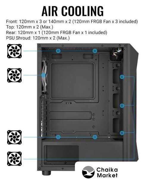 | Конфигурация вентиляторов | Передняя панель: 120 мм x 3 или 140 мм x 2 (Вентиляторы 120 мм FRGB включены x 3)Верхняя панель: 120 мм x 2 (Макс.)Задняя панель: 120 мм x 1 (Вентиляторы 120 мм FRGB включены x 1)Кожух блока питания: 120 мм x 2 (Макс.) |