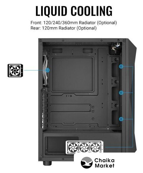 | Расположение СЖО | Передняя панель: 120/240/360 мм радиатор (Опционально)Задняя панель: 120 мм радиатор (Опционально) |