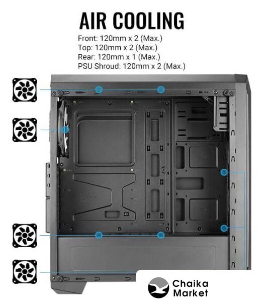 Конфигурация вентиляторов | Передняя панель: 120 мм x 2 (Макс.)Верхняя панель: 120 мм x 2 (Макс.)Задняя панель: 120 мм x 1 (Макс.)Кожух блока питания: 120 мм x 2 (Макс.) |
