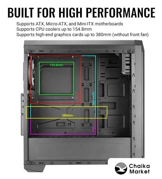 аквариум/Mid Tower, БП отсутствует, для плат ATX/micro-ATX/mini-ITX, окно: закаленное стекло, видеокарта до 410 мм, охлаждение ЦП до 176 мм, пылевые фильтры, 2xUSB-A 3.2 5Гбит/с, цвет черный
