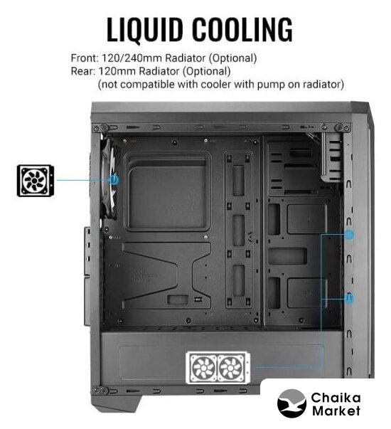 Расположение СЖО | Передняя панель: 120/240 мм радиатор (Опционально)Задняя панель: 120 мм радиатор (Опционально) (не совместимо с кулером, оснащенным насосом на радиаторе) |