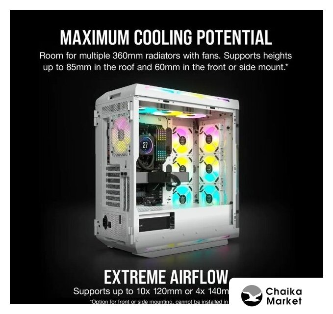 | Конфигурация вентиляторов | спереди: 3x 120 мм / 2x 140 ммсверху: 3x 120 мм / 2x 140 ммсбоку: 3x 120 ммсзади: 1x 120 мм |