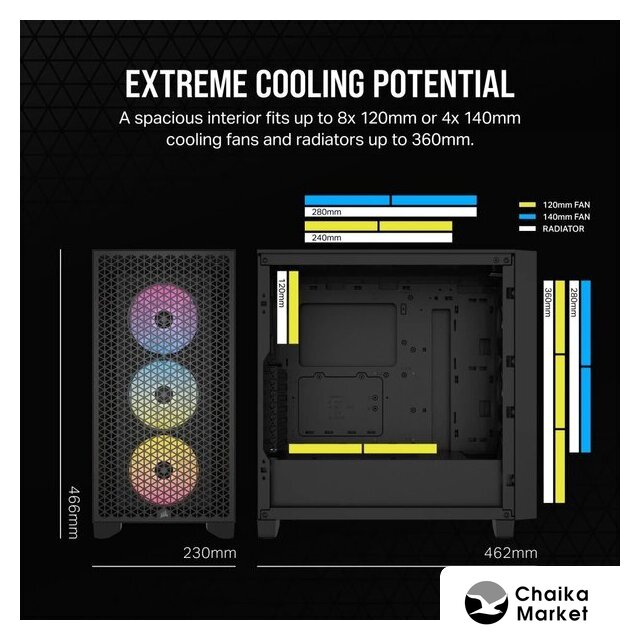 | Конфигурация вентиляторов | спереди: 3 x 120 мм или 2 x 140 ммсверху: 2 x 120 мм или 2 x 140 ммснизу: 2 x 120 ммсзади: 1 x 120 мм |