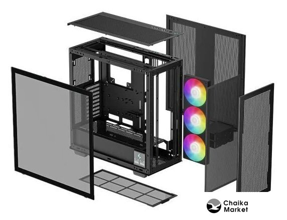 Mid Tower, БП отсутствует, для плат ATX/micro-ATX/mini-ITX, в комплекте 4 вентилятора, окно: закаленное стекло, видеокарта до 340 мм, охлаждение ЦП до 170 мм, пылевые фильтры, 2xUSB-A 3.2 10Гбит/с, 1xUSB-C 2x2 20Гбит/с, цвет черный