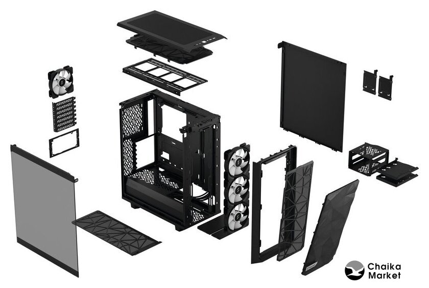 Mid Tower, БП отсутствует, для плат ATX/micro-ATX/mini-ITX, в комплекте 3 вентилятора, окно: закаленное стекло, видеокарта до 345 мм, охлаждение ЦП до 169 мм, пылевые фильтры, 2xUSB-A 3.2 5Гбит/с, цвет черный