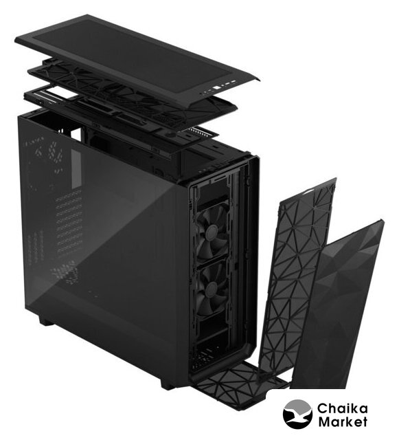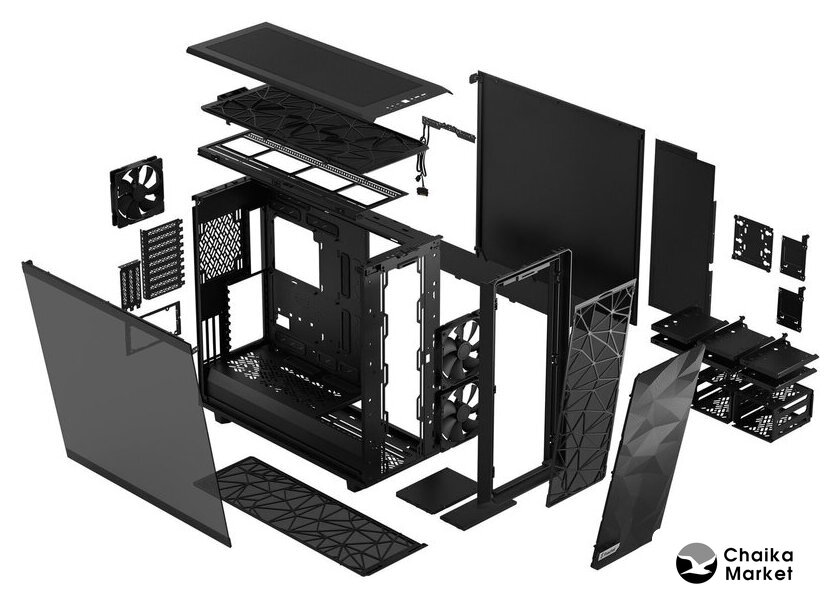 аквариум/Mid Tower, БП отсутствует, для плат ATX/micro-ATX/eATX/mini-ITX, в комплекте 14 вентиляторов, окно: закаленное стекло, видеокарта до 443.8 мм, охлаждение ЦП до 166 мм, пылевые фильтры, 2xUSB-A 3.2 5Гбит/с, 1xUSB-C 3.2 5Гбит/с, цвет черный