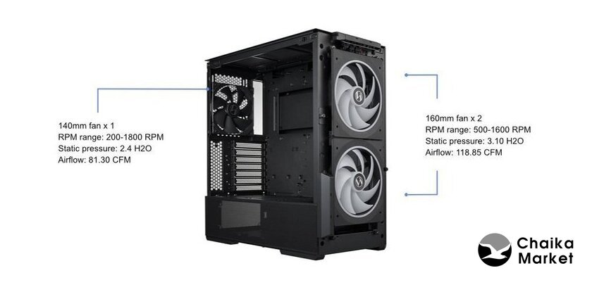 | Конфигурация вентиляторов | спереди: 3 x 120mm / 2 x 140mm / 2 x 160mmсверху: 3 x 120mm / 2 x 140mmснизу: 2 x 120mm / 2 x 140mmсзади: 1 x 120mm / 1 x 140mmкронштейн вентилятора PCIe: 1 х 120mmВ комплекте:спереди: 2 x 160mm PWMсзади: 1 x 140mm PWM |