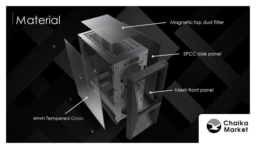 Mid Tower, БП отсутствует, для плат ATX/micro-ATX/mini-ITX, в комплекте 4 вентилятора, окно: закаленное стекло, видеокарта до 345 мм, охлаждение ЦП до 158 мм, пылевые фильтры, 1xUSB 2.0, 1xUSB-A 3.2 5Гбит/с, 1xUSB-C 3.2 5Гбит/с, цвет черный