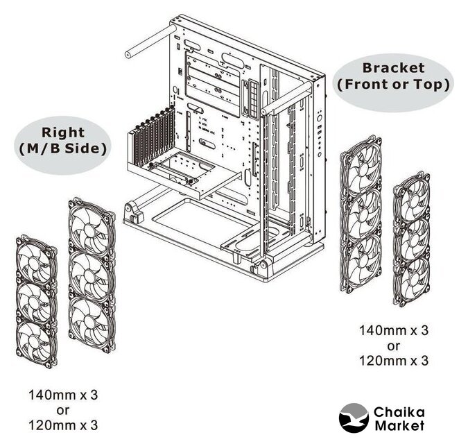 | Конфигурация вентиляторов | спереди: 3 x 120 мм или 3 x 140 ммсверху: 3 x 120 мм или 3 x 140 ммсбоку: 3 x 120 мм или 3 x 140 мм |