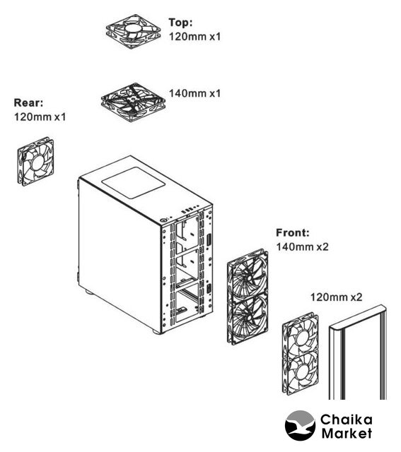 Mid Tower, БП отсутствует, для плат ATX/micro-ATX/mini-ITX/eATX/EE-ATX/SSI EEB, с 5 вентиляторами в комплекте, с контроллером вращения, окно: закаленное стекло, видеокарта до 380 мм, охлаждение ЦП до 180 мм, пылевые фильтры, 2xUSB-A 3.2 5Гбит/с, 1xUSB-C 3.2 5Гбит/с, цвет черный