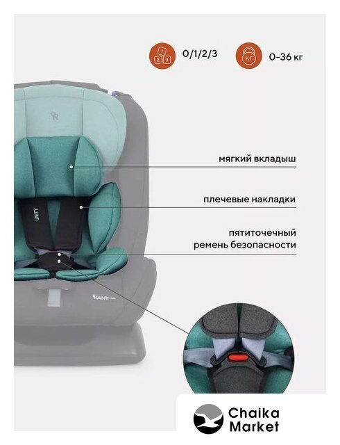 кресло, группа 0/1/2/3 (до 36 кг), крепление посредством ремней автомобиля, ремни: внутренние пятиточечные, боковая защита