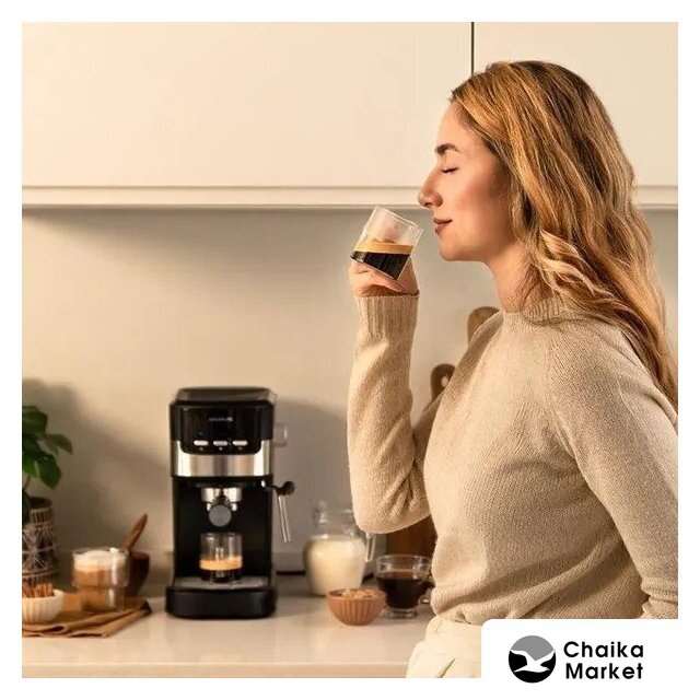 1350 Вт, корпус металл/пластик, капучинатор автоматический, используемый кофе: молотый, цвет серебристый/черный
