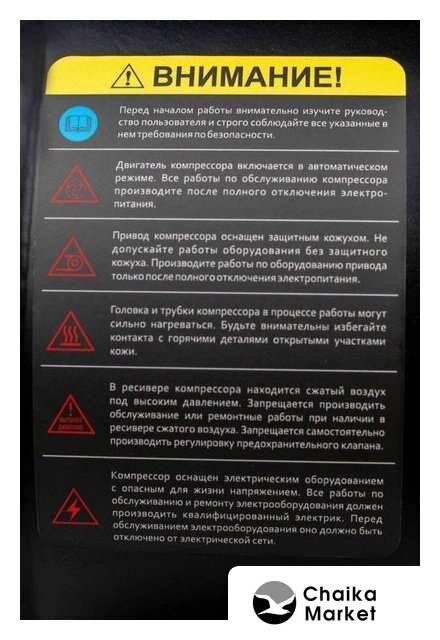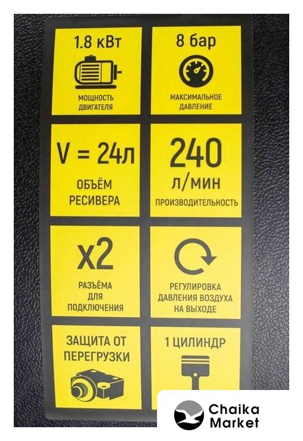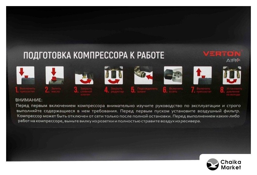 | Комплектация | 1. Компрессор - 1 шт2. Колёса - 2 шт3. Воздушный фильтр - 1 шт4. Руководство по эксплуатации - 1 шт5. Сапун - 1 шт |