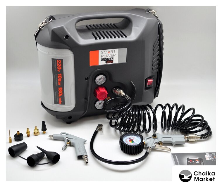 | Комплект поставки | - Воздушный компрессор SAC-300 - 1 шт.- Пневмошланг с разъёмами - 1 шт.- Пневмопистолет с манометром - 1 шт.- Продувочный пистолет - 1 шт.- Ремень для переноски - 1 шт.- Дополнительные насадки для накачки - 7 шт.- Руководство по эксплуатации- Гарантийный талон- Упаковочная коробка |