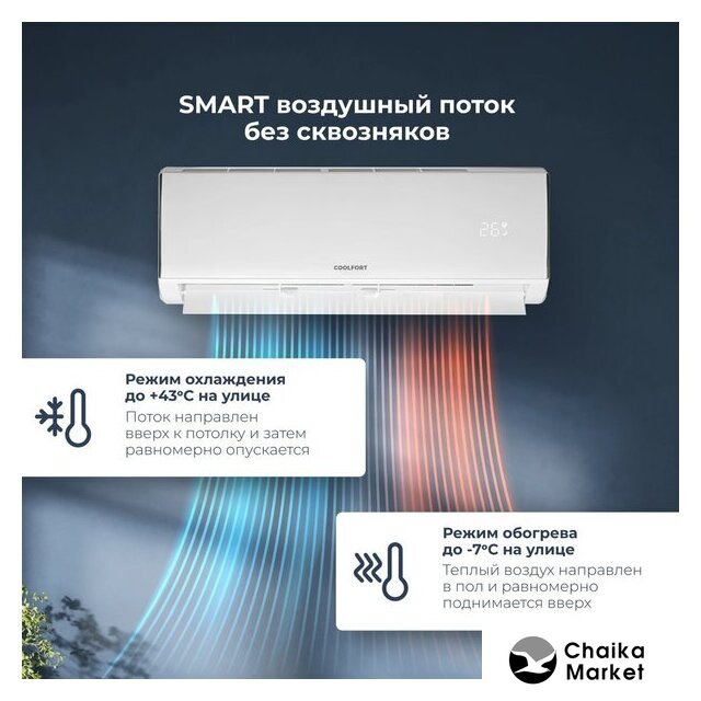 мощность охлаждения 2.05 кВт, мощность обогрева 2.2 кВт, обслуживаемая площадь 20 м²