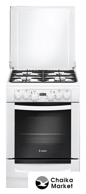 газовая панель + газовый духовой шкаф, газ-контроль конфорок, поверхность: эмалированная сталь, крышка из закалённого стекла, управление механическое, таймер механический, размеры (ШхГхВ): 60x60x85 см, цвет белый