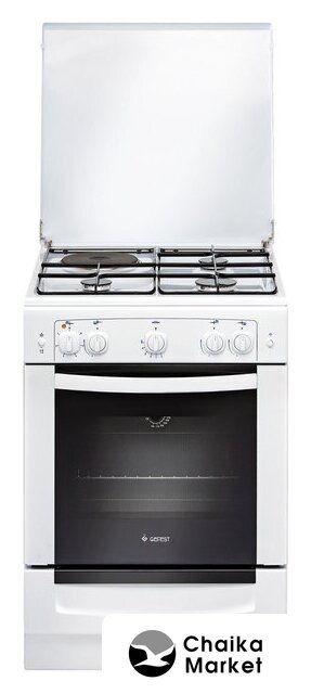 газ+электро панель + электрический духовой шкаф, поверхность: эмалированная сталь, крышка из эмалированной стали, управление механическое, таймер механический, размеры (ШхГхВ): 60x60x85 см, цвет белый